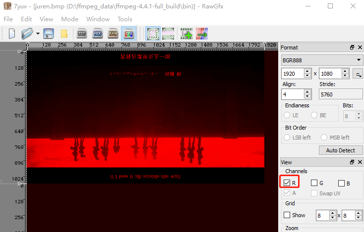 为什么 RGB 色彩空间不符合 HVS 的感知能力,现在提供一个juren.bmp 图像,里面是 RGB24 真彩色数据。用 7yuv 打开,如下图: