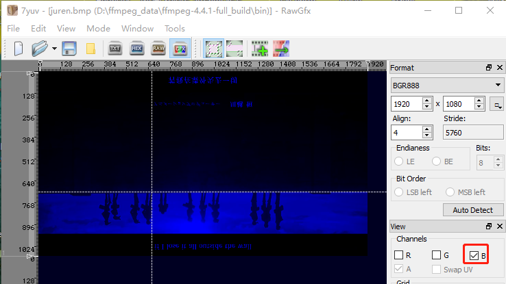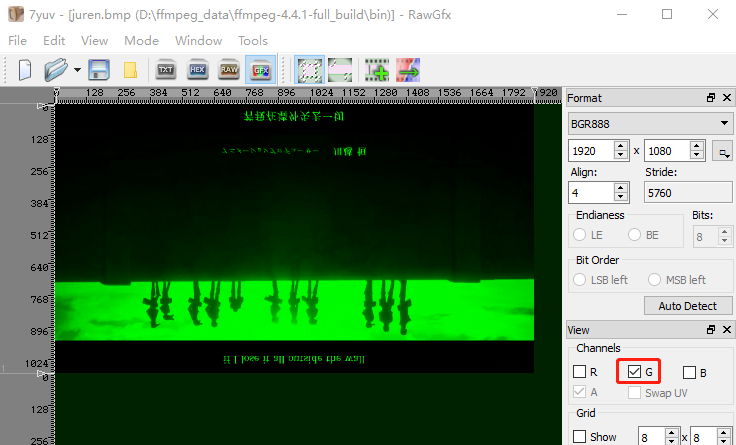 为什么 RGB 色彩空间不符合 HVS 的感知能力,现在提供一个juren.bmp 图像,里面是 RGB24 真彩色数据。用 7yuv 打开,如下图: