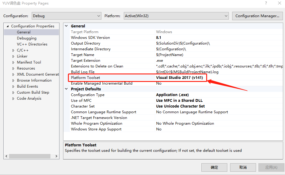 这个调色板是 岳麓吹雪 用MFC 写的,需要安装 VS2017 跟 MFC 组件,因为这个项目比较旧,需要改一下配置,如下图,把 Platform Toolset 换成 v2017,