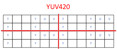 所以,422 格式,是第一第二个像素共享 一组UV,第三第四像素共享 一组 UV,以此类推,如下图: